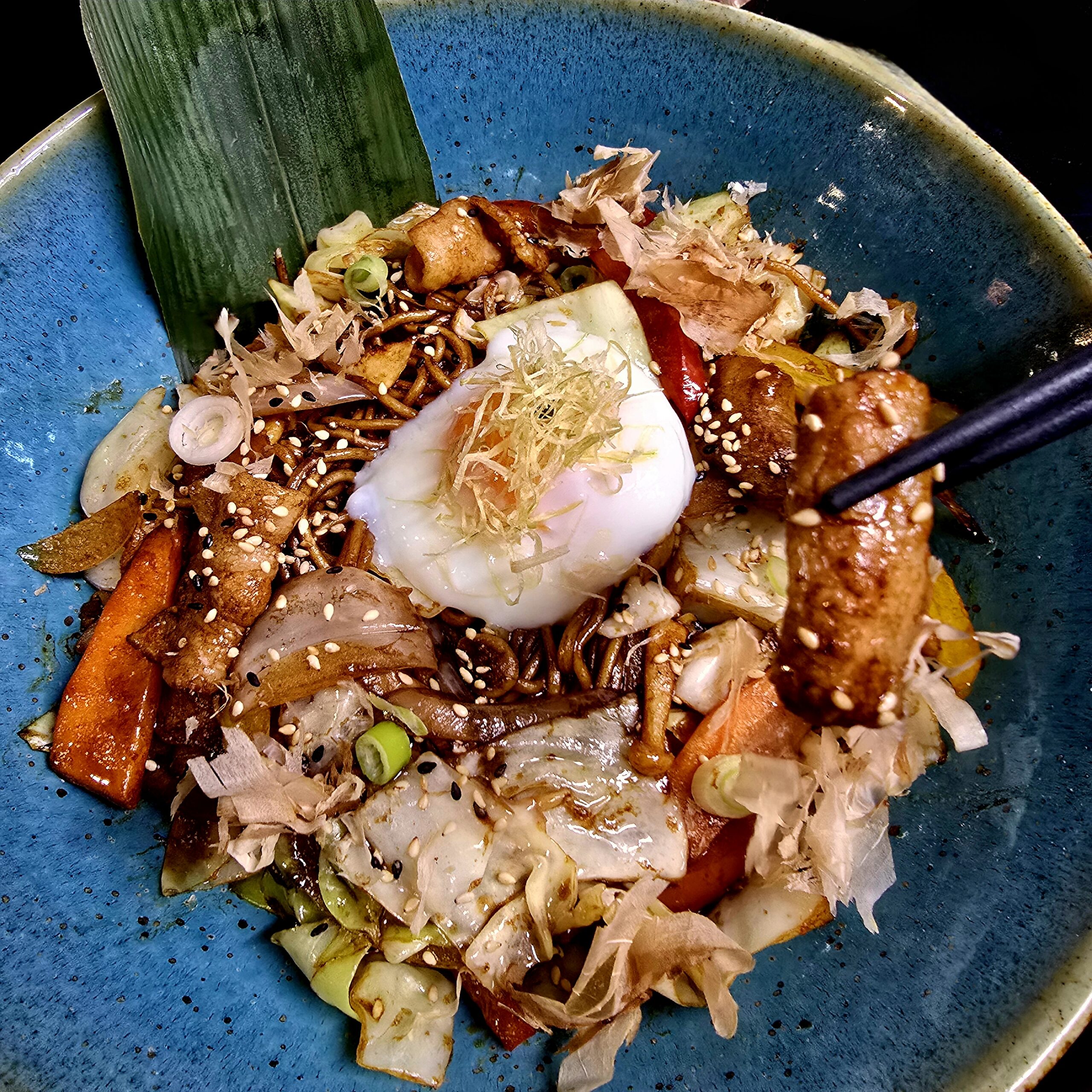 Choice of stir-fried SOBA or UDON noodles with vegetables and 63°C egg yolk
