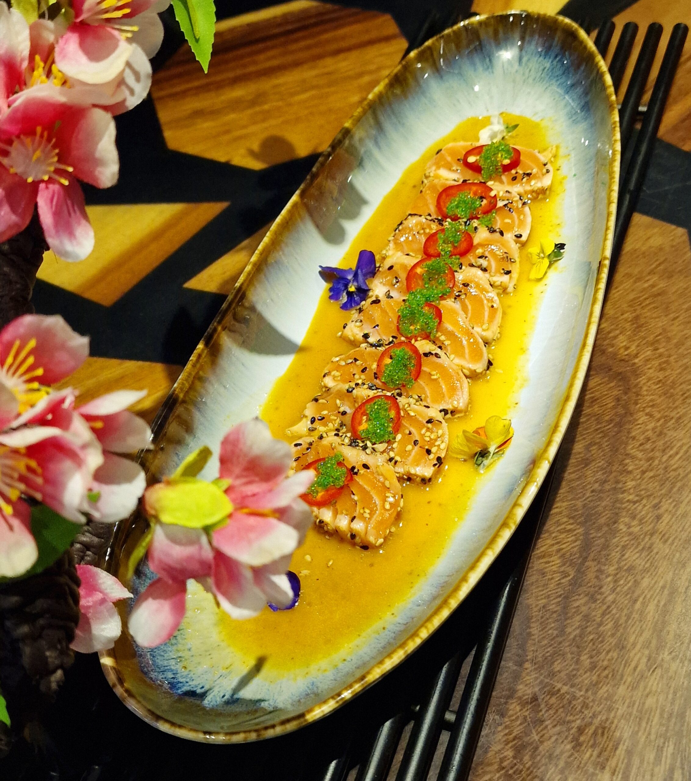 £14.50Seared salmon sashimi topped with tobiko, orange, wasabi & ponzu sauce (7 pieces)